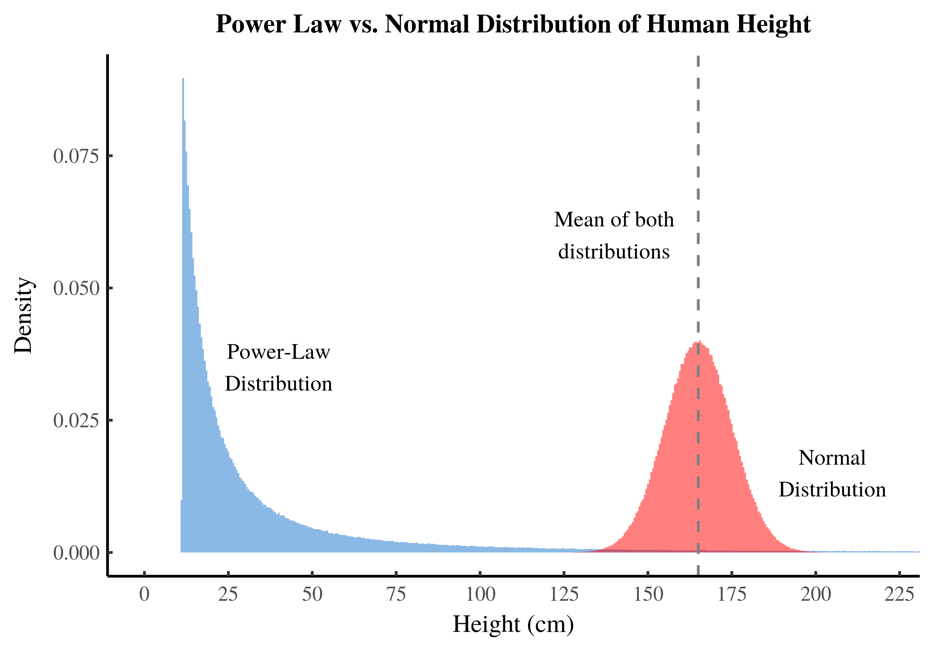 Source: Blair Fix; Example of a Power Law Distribution versus the commonly found Normal Distribution shown in the Frequency of Human Height.