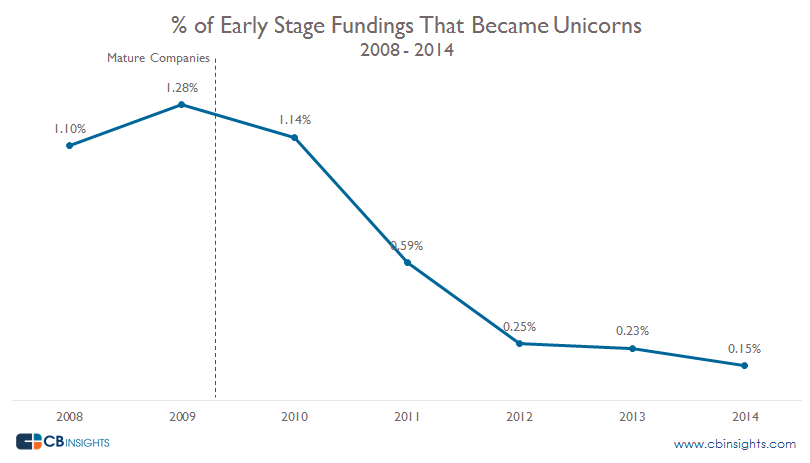 Source: CB Insights; Percentage of Early Stage Fundings that Became Unicorns from 2008 to 2014 is about 1% on average.
