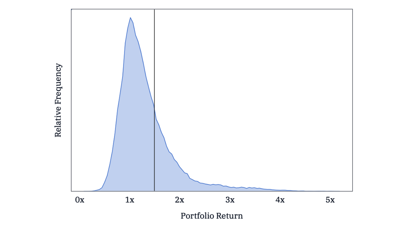 Source: AngelList; The black vertical line represents the market return, which is based on the 1/N strategy, and the peak of the curve represents the most frequently observed outcome from a 10-investment portfolio.