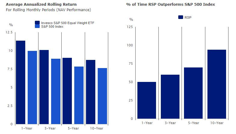 Source: Invesco, FactSet Research; Historical Outperformance of an Equally-Weighted 1/N ETF (RSP) tracking the S&P 500 Index versus the Market-Cap Weighted S&P 500 Index.